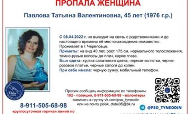 Уже четвртый день в Череповце ищут ТатьянуПавлову, которая не выходит на связь с родными с 8 апреля. У 45-летней череповчанки темно-русые волосы до плеч и карие глаза. Рост пропавшей 175 см, у нее нормальное телосложение. На вид женщине около 40 лет.